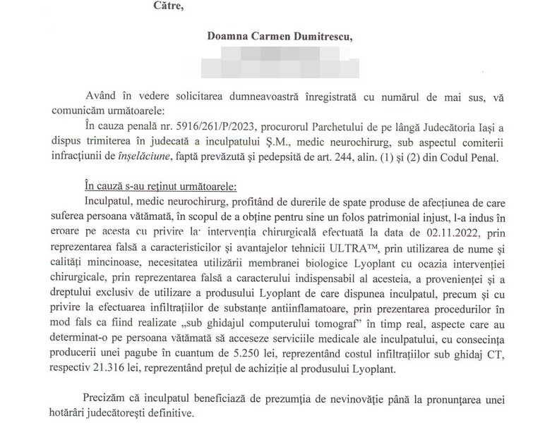 Potrivit documentului oficial, procurorii susțin că medicul ar fi indus în eroare un pacient prin prezentarea falsă a unor proceduri medicale și a unor produse utilizate în intervenții chirurgicale. Concret, ancheta arată că pacientului i-ar fi fost prezentate în mod înșelător avantajele unei tehnici chirurgicale și necesitatea utilizării unor „membrane biologice” – produse care, în realitate, nu ar fi avut caracteristicile promise. Mai mult, procurorii susțin că pacientul a fost convins să accepte proceduri costisitoare, inclusiv infiltrații prezentate ca fiind realizate „sub ghidaj CT în timp real”, ceea ce ar fi fost fals.
