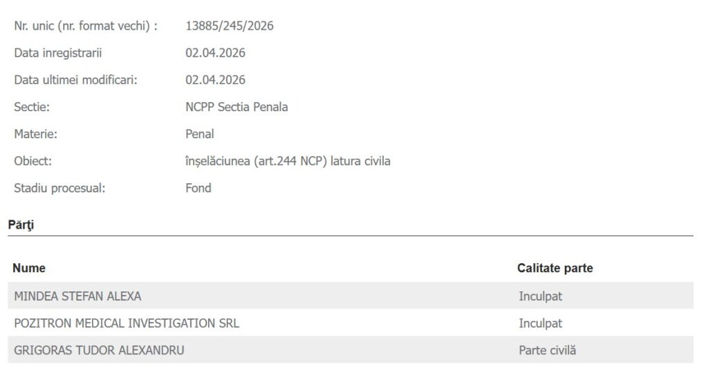 Mai facem precizarea că în acest dosar trimis în judecată la Iași se mai regăsește, în calitate de inculpate, și Clinica POZITRON MEDICAL INVESTIGATION SRL, parte a rețelei private de clinici medicale Regina Maria, care nu a avut nicio problemă în toți acești ani în a fi o umbrelă pentru activitatea cel puțin controversată, dacă nu chiar problematică, a acestui medic.